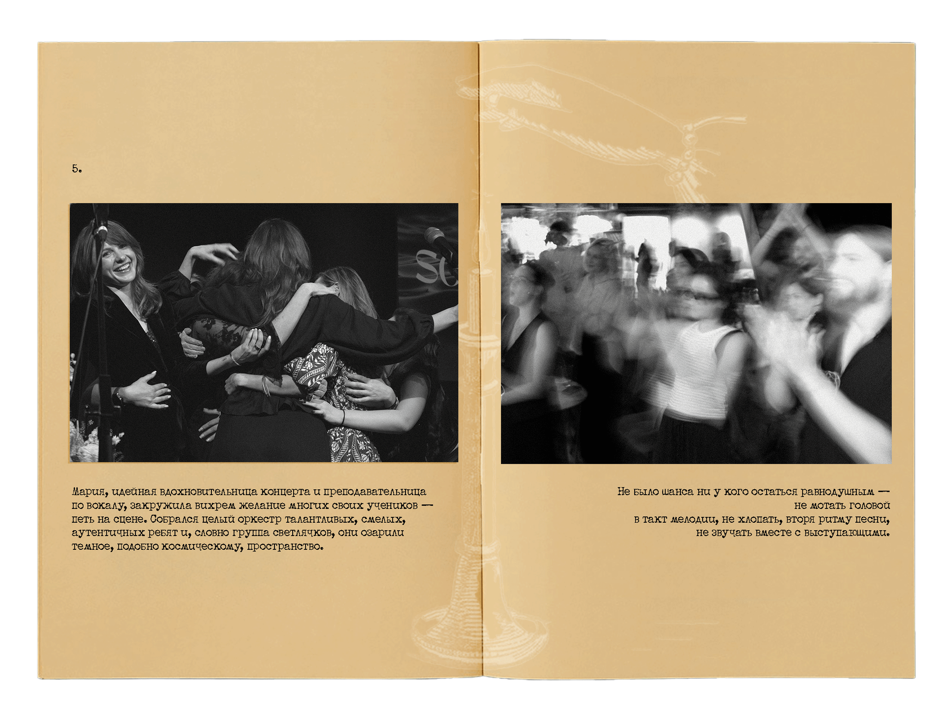 Мария, идейная вдохновительница концерта и преподавательница по вокалу, закружила вихрем желание многих своих учеников — петь на сцене. Собрался целый оркестр талантливых, смелых, аутентичных ребят и, словно группа светлячков, они озарили темное, подобно космическому, пространство. Не было шанса ни у кого остаться равнодушным — не мотать головой в такт мелодии, не хлопать, вторя ритму песни, не звучать вместе с выступающими.